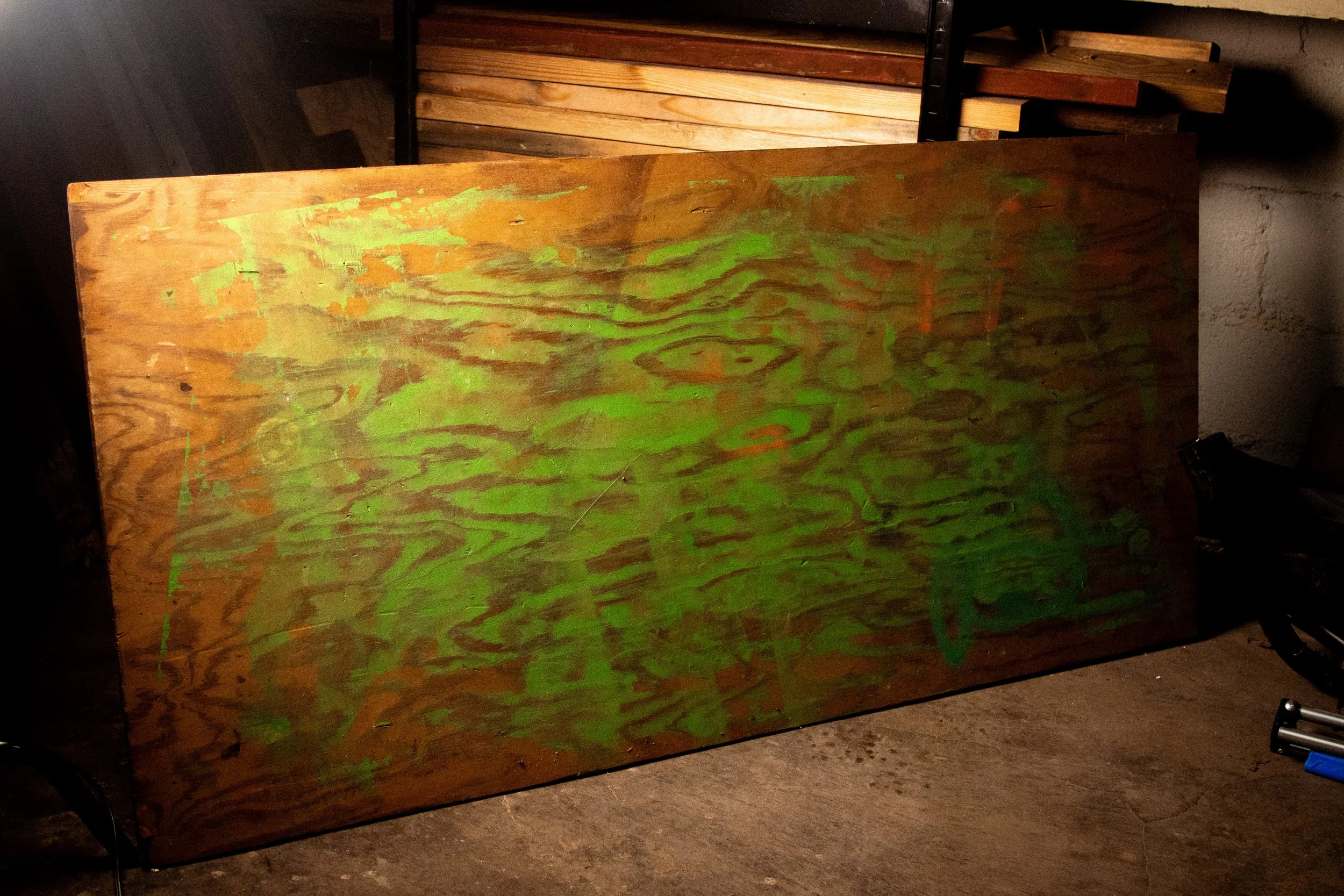 THIS WAS AN OLD TABLE TOP WITH A TERRIBLE FAKE VENEER ON IT. I RIPPED THAT VENEER OFF AND PAINSTAKINGLY SANDED DOWN ALL THE ADHESIVE. THE SPRING AND FALL GROWTH RINGS OF WOOD EXPAND DIFFERENTLY OVER TIME, LEAVING A SUBTLE TEXTURE. I PAINTED THIS TABLE TOP GREEN, THEN SANDED THE TOP, KNOCKING DOWN THE HIGH RINGS BUT LEAVING THE GREEN PAINT IN THE LOW SPOTS. I THINK THATS COOL.